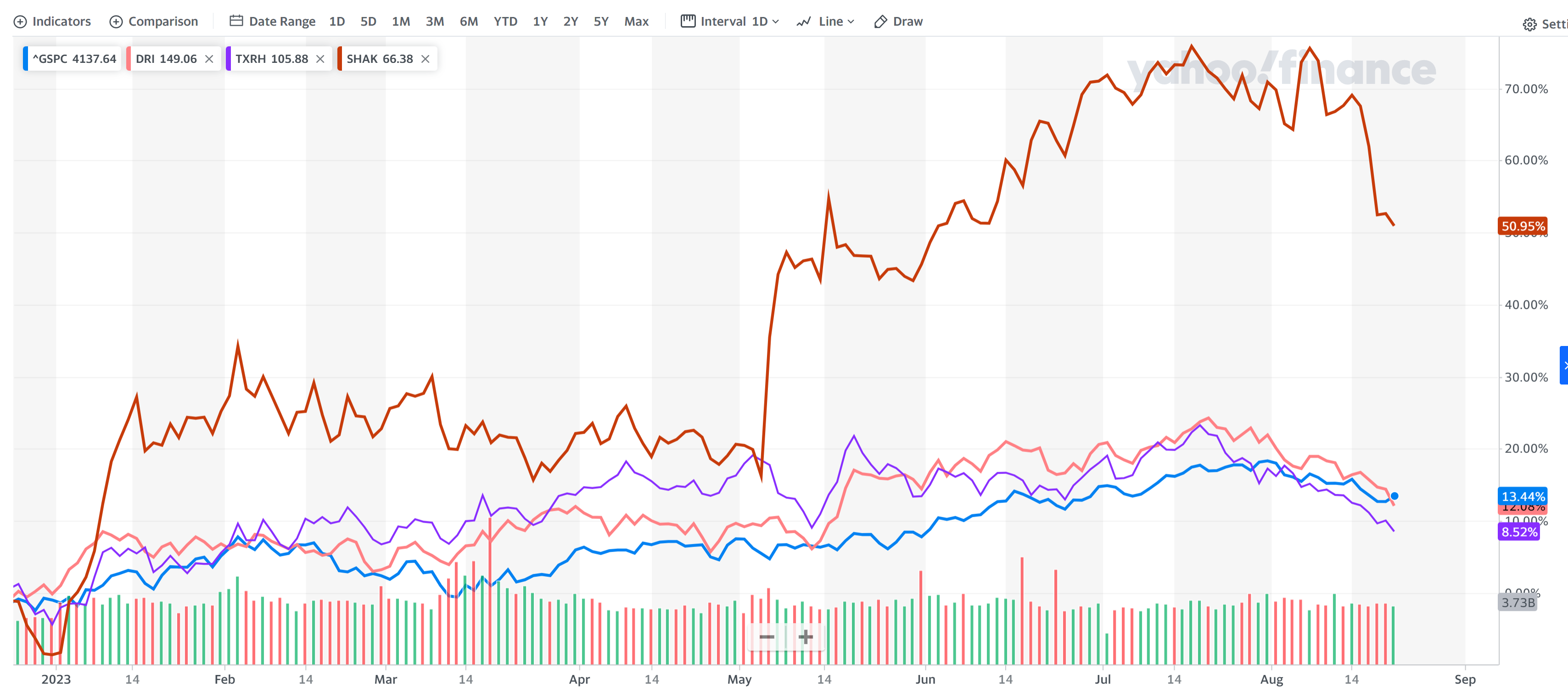 다덴 레스토랑, 쉐이크쉑, 텍사스 로드하우스는 S&P500 지수를 추월하여 지난 1년동안 엄청나게 올랐다.