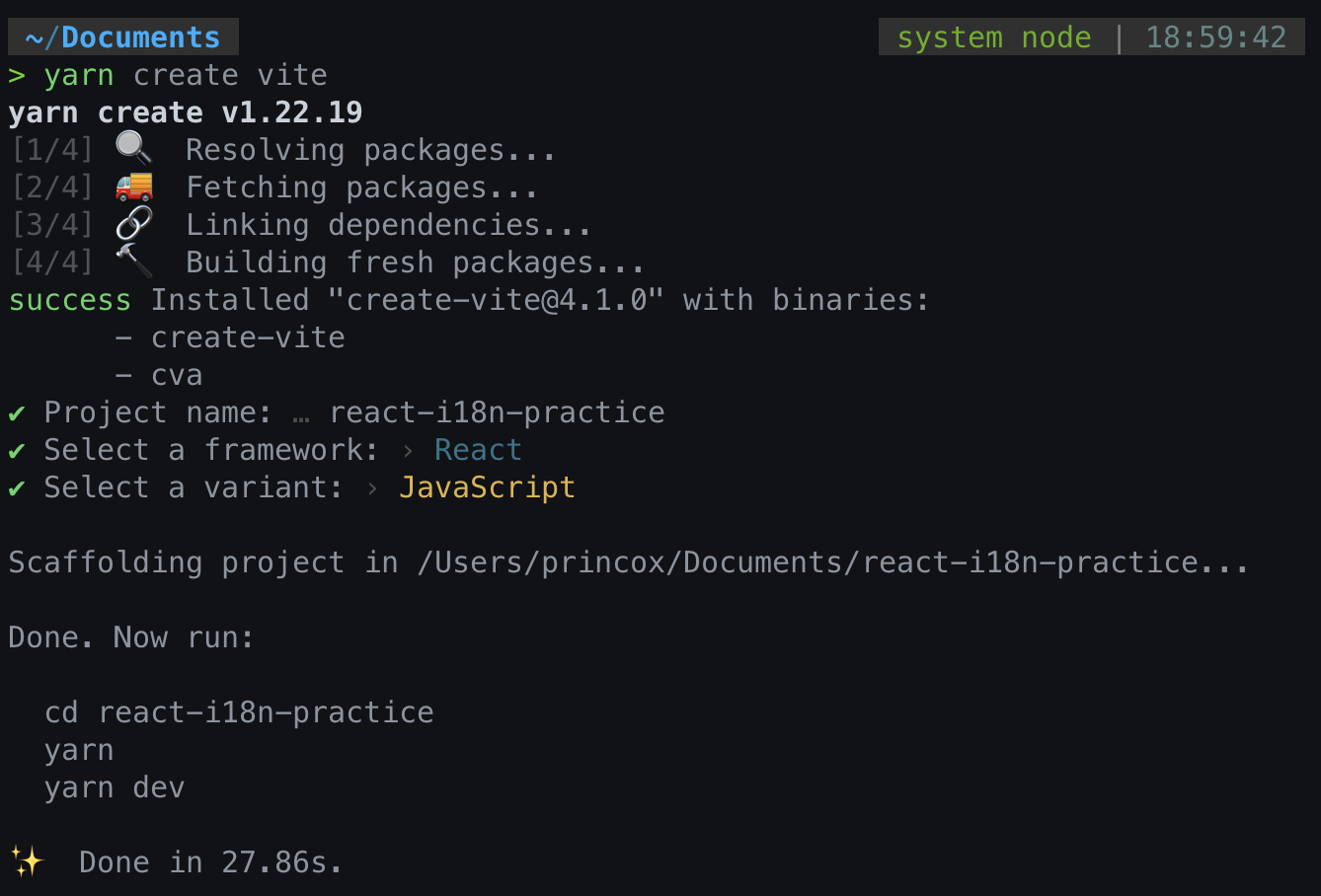 터미널에서 yarn create vite를 통해 vite 세팅을 실행시키고,